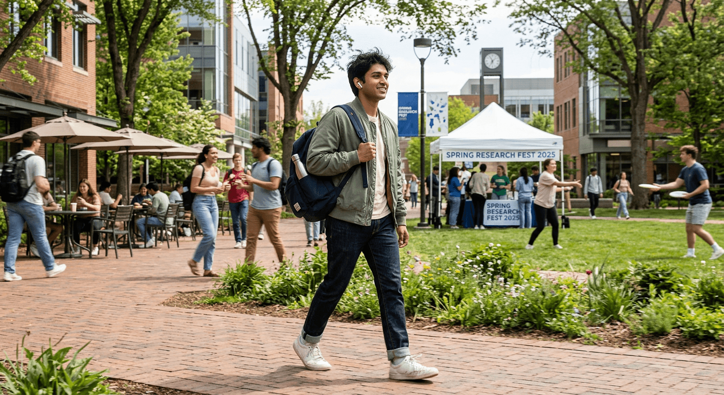 A confident college student walks across a sunny campus quad with earbuds in and calm focus, representing how many young adults navigate campus hookup culture with self‑awareness, balance, and personal growth amid modern student life.
