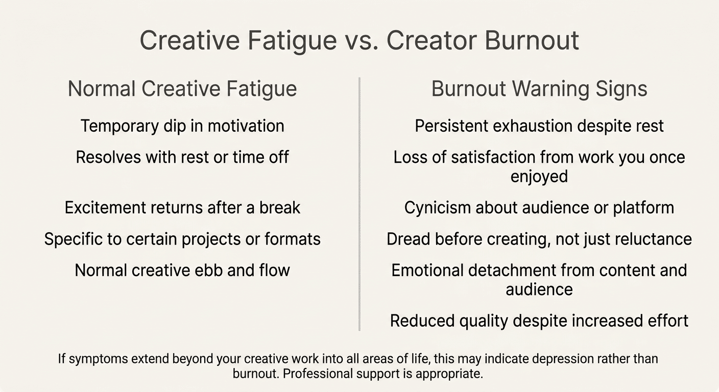 Creative fatigue is normal and temporary a natural ebb in motivation that resolves with rest. Burnout is more persistent and pervasive. Creator burnout prevention requires knowing the difference.